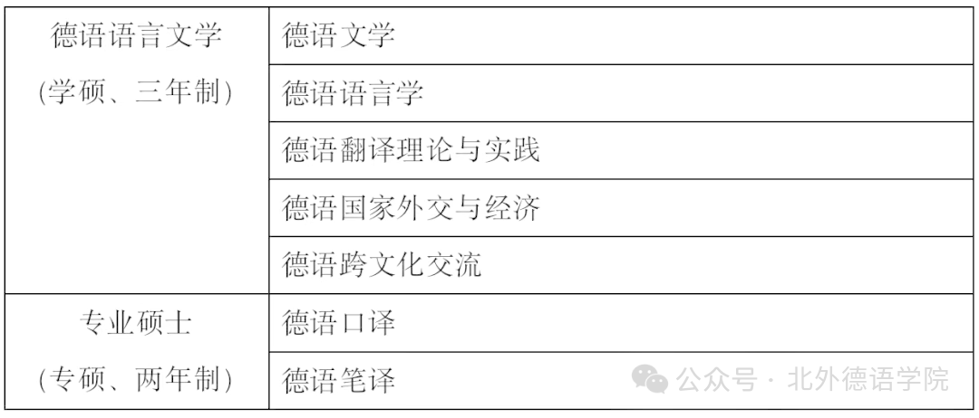 2026年学院学术型硕士研究生招生专业为德语语言文学,包含五大研究方向。专业型硕士招生专业包含两大研究方向。具体如下表: