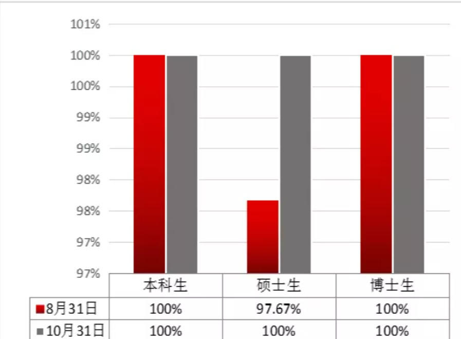 2019-2020学年,在学校党委的正确领导下,beat365官网认真贯彻落实党中央和学校就业工作要求,探索全员、全方位、全过程的“三全就业模式”,师生同心,群策群力,攻坚就业难题。疫情期间,我们制定“抗疫情、促就业”工作方案,从“稳就业、清意向、扩领域、新方法、推实策、导方向”等六个方面,扎实开展就业工作。截止8月31日,本科生初次就业率为100%,硕博研究生初次就业率为97.67%。截止10月31日,本科生、研究生就业率均为100%,总体就业率为99.57%,居全校第二,比2019年毕业生就业率提升了15.26%。