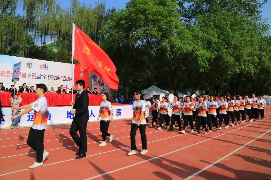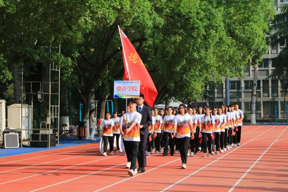 经过多次认真训练,开幕式上,由52名学生和12名教师组成的beat365英国官网网站师生方阵身着由学生设计的统一院服,迈着整齐的步伐,带着昂扬的气势走过主席台前,他们举起的“喜迎双庆,砥砺奋进;德语师生,再创佳绩”手牌彰显着德语师生对北外的祝福以及对学院的美好期盼。
