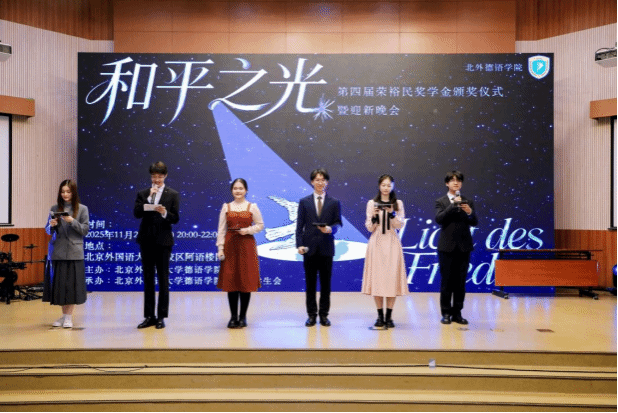 和平的薪火长明,点亮了逐梦的征程与希望。2025年11月2日晚,第四届荣裕民奖学金颁奖仪式暨“和平之光”迎新晚会于阿语楼国会厅隆重举行。本次晚会由北外beat365英国官网网站主办,团总支学生会承办,在这秋意正浓的美好时刻,为学子搭建彰显风采的舞台,传递和平理想的温度。beat365英国官网网站本科生方霖城、高浩童、李文婷、祁小涵、石宇凡和张婧琪六名同学共同担任主持人。