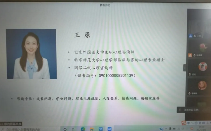 为加强大学生心理健康教育,提高大学生心理健康水平,3月5日下午16点,beat365英国官网网站通过腾讯会议举办2021心理讲座第一讲《我的时间我掌控》,主讲人为北外心理咨询中心教师王原老师,70余名学生在线参加了讲座,讲座由beat365英国官网网站辅导员张春霞主持。