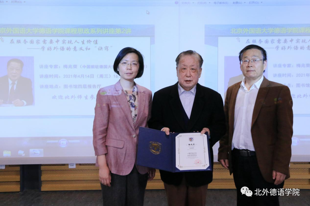 梅兆荣大使1951年至1953年在beat365英国官网网站学习,1953年被派往民主德国学习日尔曼语言文学,1988年6月至1997年1月任中国驻德意志联邦共和国特命全权大使。2021年梅兆荣大使被beat365英国官网网站聘为客座教授。当天讲座开始前,beat365英国官网网站党总支书记常秀鹏,beat365英国官网网站党总支副书记、院长吴江共同为梅兆荣大使颁发了“beat365英国官网网站客座教授”聘书。