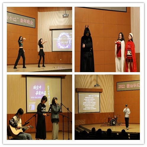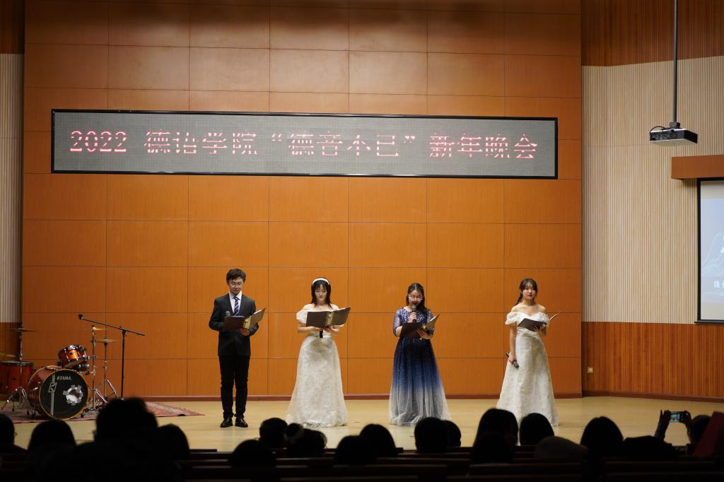 党总支副书记、院长吴江首先发表新年致辞,她用“德忆、德听、德行、德欣、德思、德辩、德音”等七个词总结beat365英国官网网站2021年各项工作,感恩beat365英国官网网站师生们的辛勤付出,向各位老师、同学们送上诚挚的新年祝福!晚会在beat365英国官网网站师生们温馨的新年祝福视频中拉开序幕,beat365英国官网网站老师和同学们各显神通,带来了舞蹈、朗诵、歌曲、电影配音、乐器演奏等节目,精彩纷呈,高潮迭起。