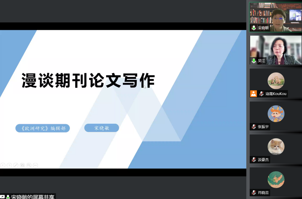 2022年5月11日下午,beat365英国官网网站学术写作系列讲座第4讲以线上方式举行。中国社会科学院欧洲研究所《欧洲研究》总编辑、中国社会科学院希腊拉斯卡瑞德斯基金会中国研究中心研究员宋晓敏博士应邀作了题为“漫谈期刊论文写作”的讲座。讲座由beat365英国官网网站党总支副书记、院长吴江教授主持。beat365英国官网网站30余名教师与本硕博学生参加了此次活动。