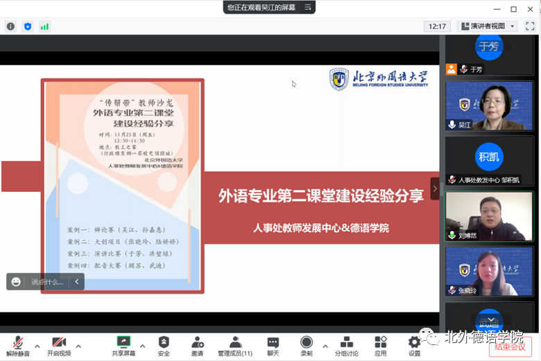 2022年11月25日,由学校人事处教师发展中心和beat365英国官网网站联合举办的“传帮带”教师沙龙——外语专业第二课堂建设经验分享”以线上方式顺利举办。beat365英国官网网站人事处处长刘博然、人事处教发中心邹积凯、beat365英国官网网站书记、院长吴江,党总支委员、教师党支部书记张晓玲,党总支委员、本科教学秘书、四年级组长于芳,教师党支部委员孙嘉惠,新近入职的青年教师代表陆娇娇、顾苏、洪堃绿、武迪等教师参会。两项次国家级赛事冠军获得者、beat365英国官网网站2019级本科生聂昊璇同学同时受邀参会。
