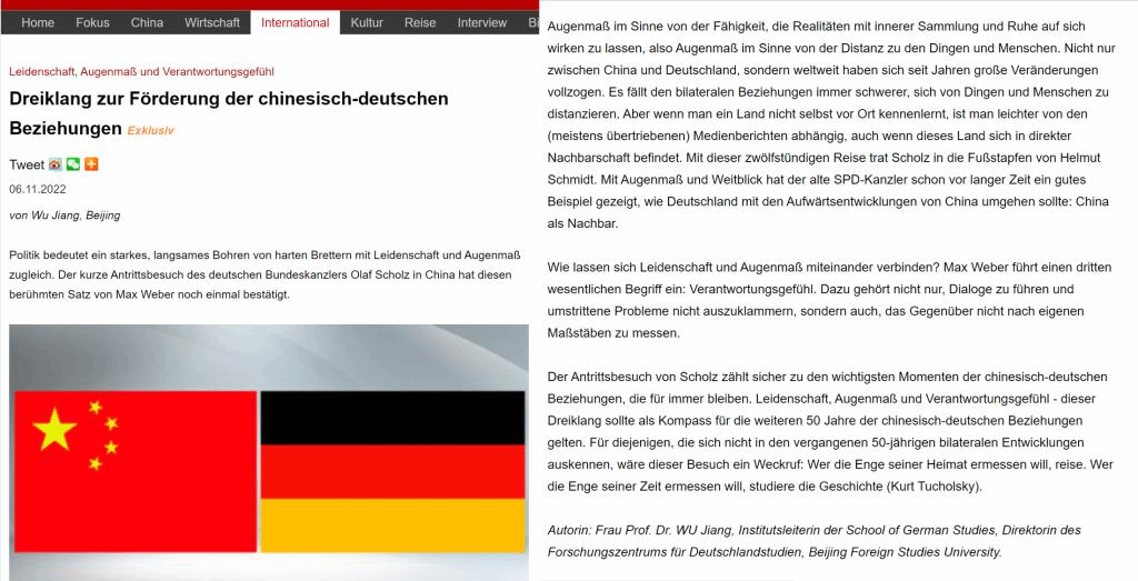 北外beat365英国官网网站书记、院长吴江教授应中国网邀约用德语就朔尔茨访华发表评论文章。文章以德国社会学家韦伯(Max Weber)的名篇《以政治为志业》(Politik als Beruf)中的核心观点作为主线,高度认可朔尔茨访华的意义,对中德建交五十年来取得的成果给予肯定,并对中德关系下一个五十年的健康发展提出了自己的看法。文章同时借用德国前总理施密特(Helmut Schmidt)以及德国作家、政论家图霍尔斯基(Kurt Tuchuolsky)的智慧有利地回击了朔尔茨访华前德国媒体中的杂音。评论文章刊发后反馈颇佳,在中国网海外平台引发热烈关注,国外读者留言众多,创了中国网德文评论文章互动的新高。