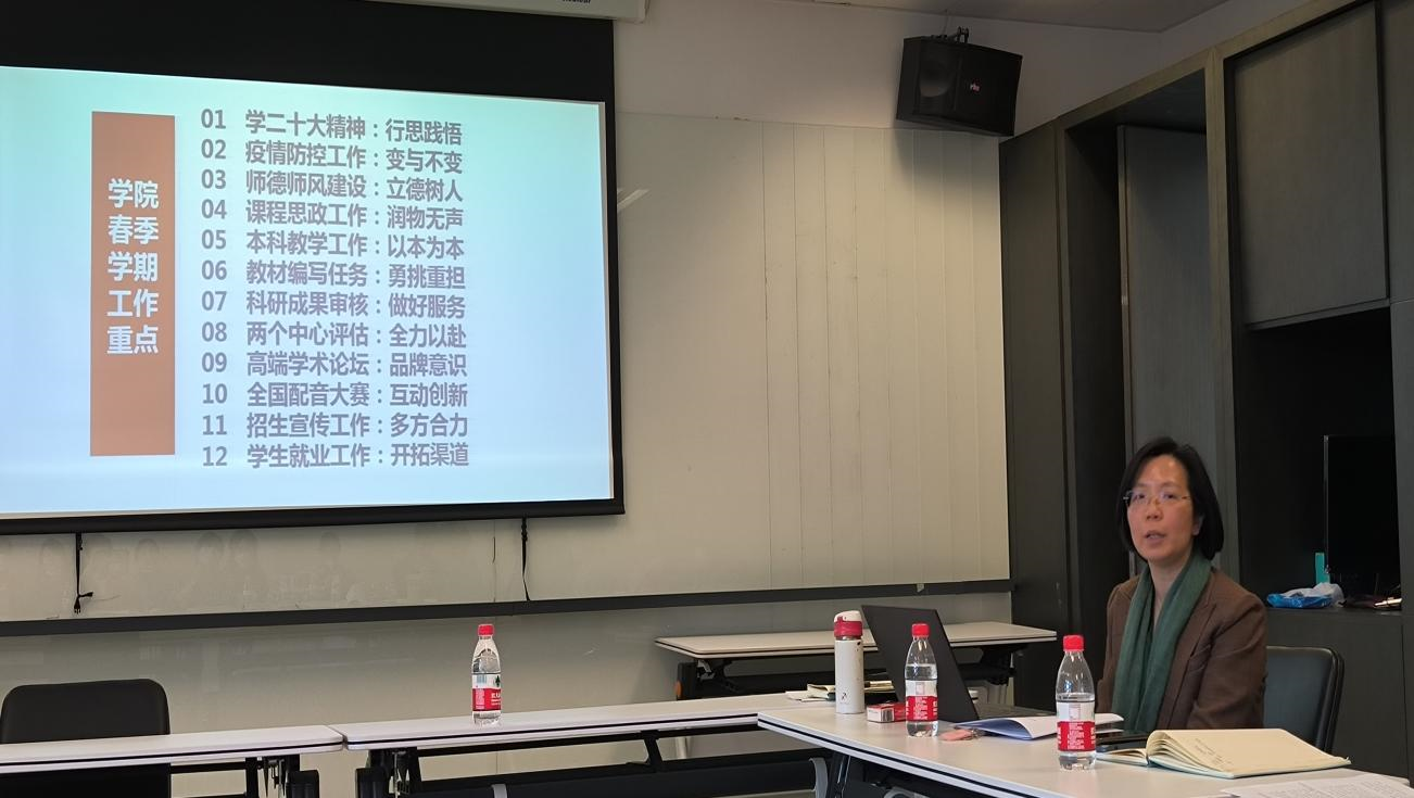 吴江回顾总结了秋季学期beat365英国官网网站在疫情防控、教学科研、学生培养、管理保障等方面工作取得的成效,感谢了专业教师、管理干部为学院发展所作的贡献。从十二个方面部署了学院春季学期的工作重点,要围绕“行思践悟”深入学习二十大精神,疫情防控工作处理好“变与不变”,落实“立德树人”狠抓师德师风建设,研究“润物无声”开展课程思政工作,坚持“以本为本”,做好本科教学工作,“勇挑重担”完成教材编写任务,“做好服务”完成科研成果审核,“全力以赴”开展两个中心的评估工作,秉承“互动创新”办好第五届全国高校本科生德语配音大赛,树立“品牌意识”筹备好第二届德语学科区域国别研究高端学术论坛,“多方合力”做好招生宣传工作,“开拓渠道”助力学生就业工作。