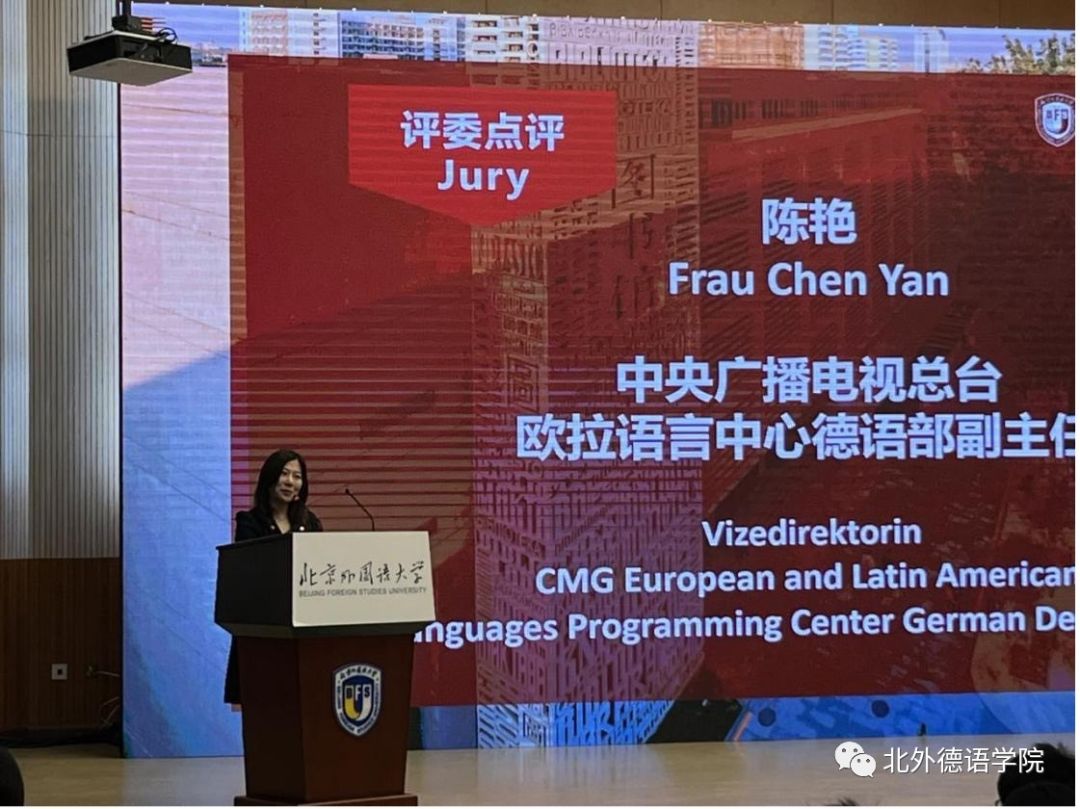本届大赛决赛邀请了贾建新参赞、北外山东校友会会长、青岛鸿裕吉交通装备有限公司总经理秦思刚、中央广播电视总台欧拉语言中心德语部副主任陈艳以及中国网德语频道主编任斌担任评委。赛事环节由beat365英国官网网站2019级本科生曹涵和2022级本科生黄婉茹用中德双语主持。