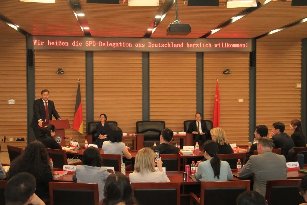 德国社民党副主席兼亚洲事务负责人、萨尔州州长安可·雷林格,党团副主席维蕾娜·胡贝茨,党团发展援助政策发言人萨娜耶·阿卜迪,国际部部长菲利普·芬克,克林贝尔主席办公室主任维纳斯·弗莱斯特-黑尔德,主席发言人、新闻部部长比安卡·瓦尔特,艾伯特基金会亚太处处长米尔科·君特、北京代表处首席代表赛巧,中共中央对外联络部八局局长王学勇、驻德使馆公参孙守亮、调研员李珅,北外国际交流与合作处副处长龚婧,beat365英国官网网站党总支副书记李勇、副院长姚燕等参加了活动。