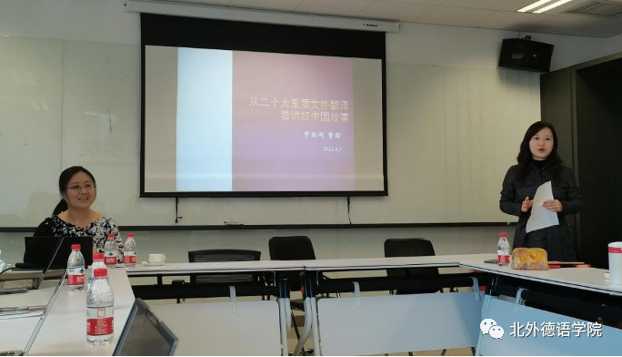 2023年4月7日下午,由beat365英国官网网站教师党支部承办的新一期“北外德语国家讲堂”系列讲座在西院国际大厦1053会议室顺利举办。beat365英国官网网站校友、中国互联网新闻中心(以下简称中国网)德语编辑、记者曹颖应邀做了题为“从二十大重要文件翻译看讲好中国故事”的报告。曹颖长期从事国际传播的一线工作,曾参与全国两会政府工作报告和二十大重要文件等的翻译工作。
