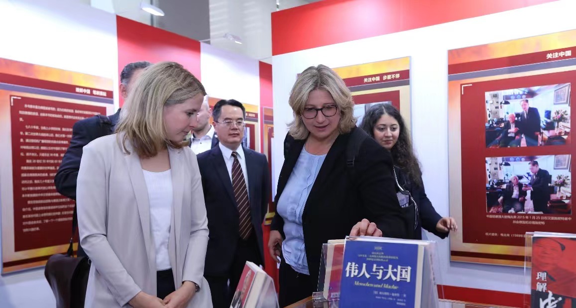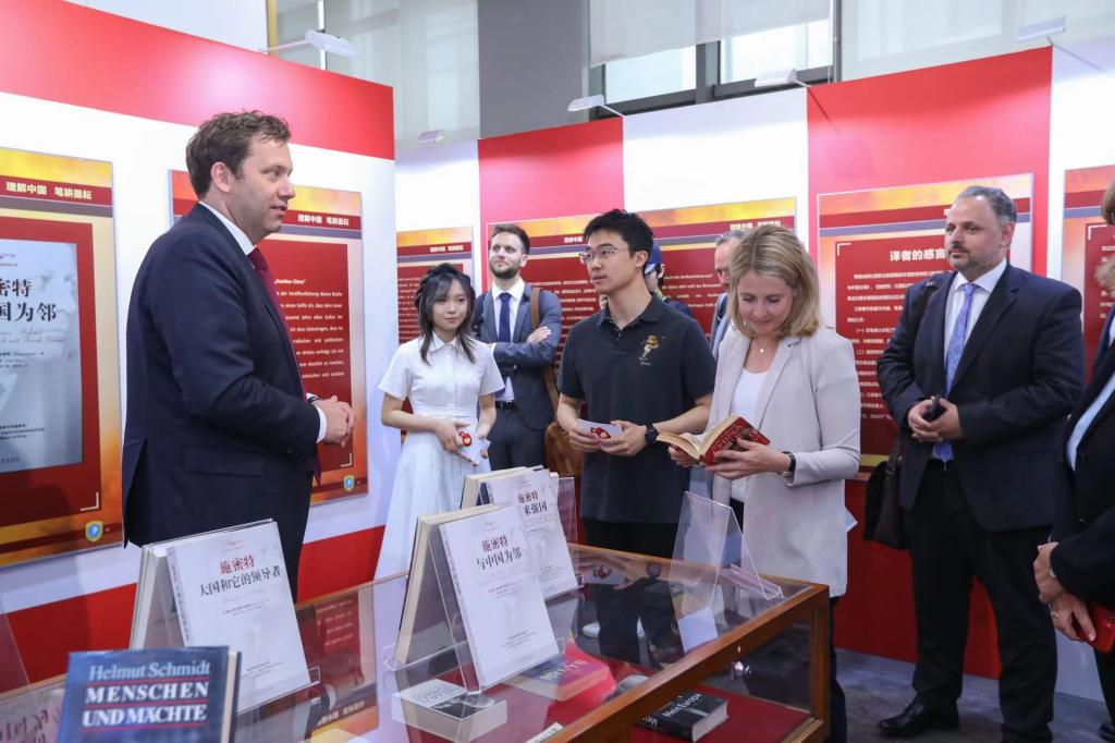 施密特一生撰写了多部以中国为主题或与中国相关的论著,许多著作的中译本都凝聚了北外校友的心血,例如中国前驻德国大使梅兆荣先生领衔翻译的《与中国为邻》(Nachbar China)、《伟人与大国》(Menschen und Mächte)以及已故北外beat365英国官网网站教授刘芳本老师领衔翻译的《行动起来 为了德国》(Handeln für Deutschland)等。展板的第四板块“理解中国 笔耕墨耘”展出了施密特经典著作的德文版以及中译本。克林贝尔在得知beat365英国官网网站图书馆藏有诸多施密特著作及中译本后表示非常感动。代表团全体成员在书籍前停下脚步,认真翻阅,并对北外德语学科点在人才培养领域做出的杰出贡献表示赞赏。