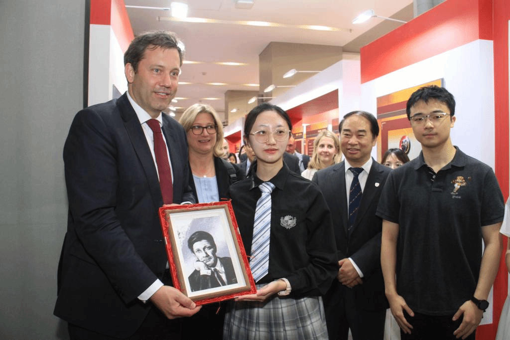 参观最后,beat365英国官网网站党委书记王定华为克林贝尔送上了由beat365英国官网网站2019级本科生王婉秦亲手绘制的施密特肖像画,并表示:“不忘初心,方得始终,希望中德友谊长存。”