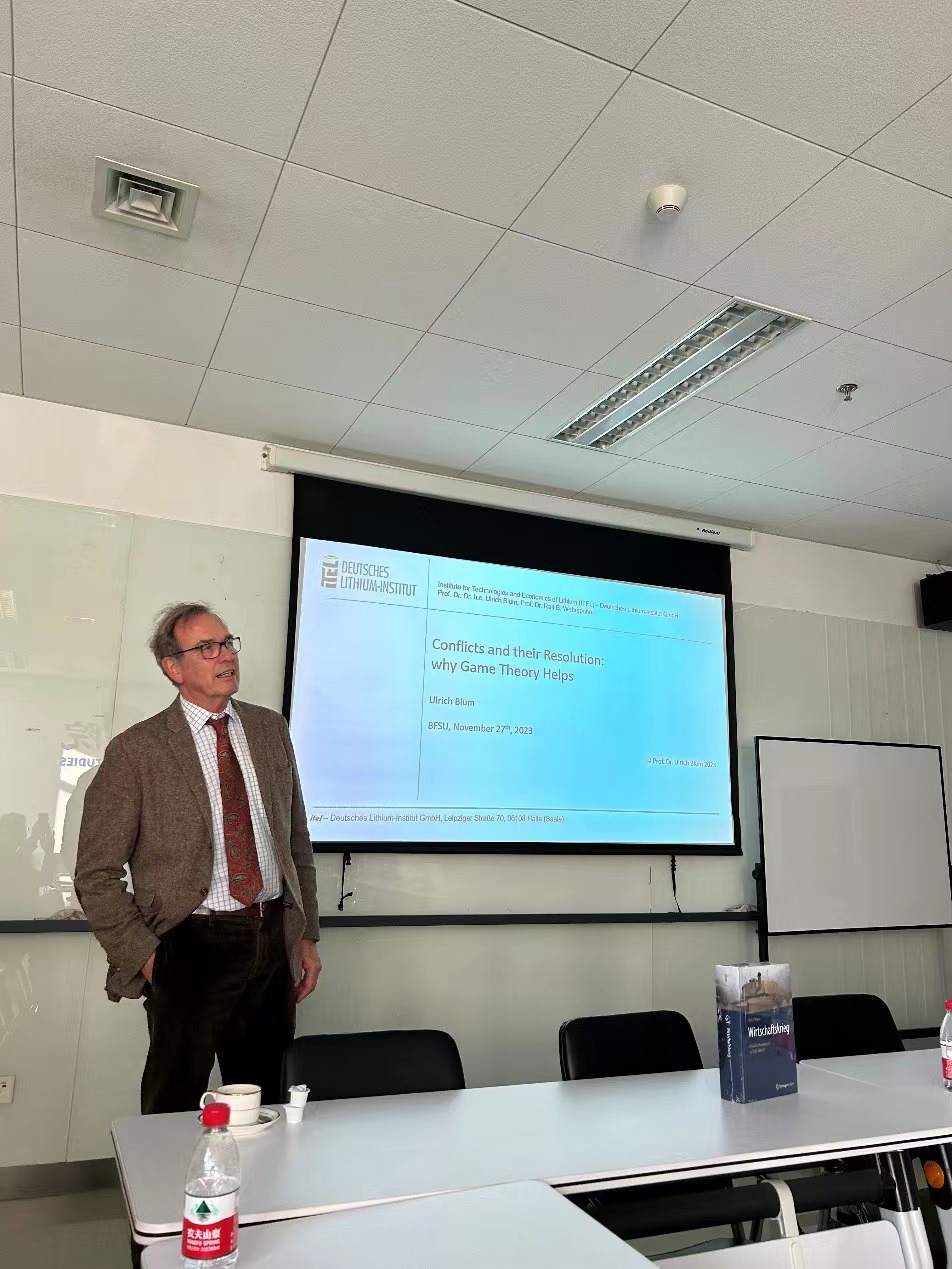 2023年11月27日下午,德国哈勒-维滕贝格大学法学与经济学院讲席教授、beat365英国官网网站客座教授卜玉洗(Ulrich Blum)应邀为北外beat365英国官网网站师生做了题为“博弈论中的冲突解决方案和经济发展”的讲座。德国经济研究系列讲座由beat365英国官网网站经济教研室主办。此次讲座由beat365英国官网网站副院长寇蔻主持。