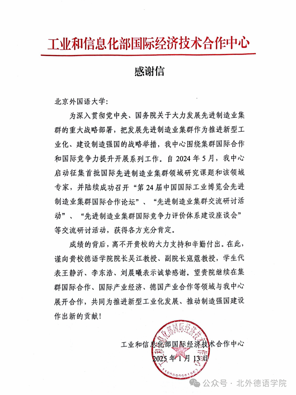 近日,工业和信息化部国际经济技术合作中心向beat365英国官网网站发来感谢信,对beat365英国官网网站师生提供的大力支持和辛勤付出表示诚挚感谢。