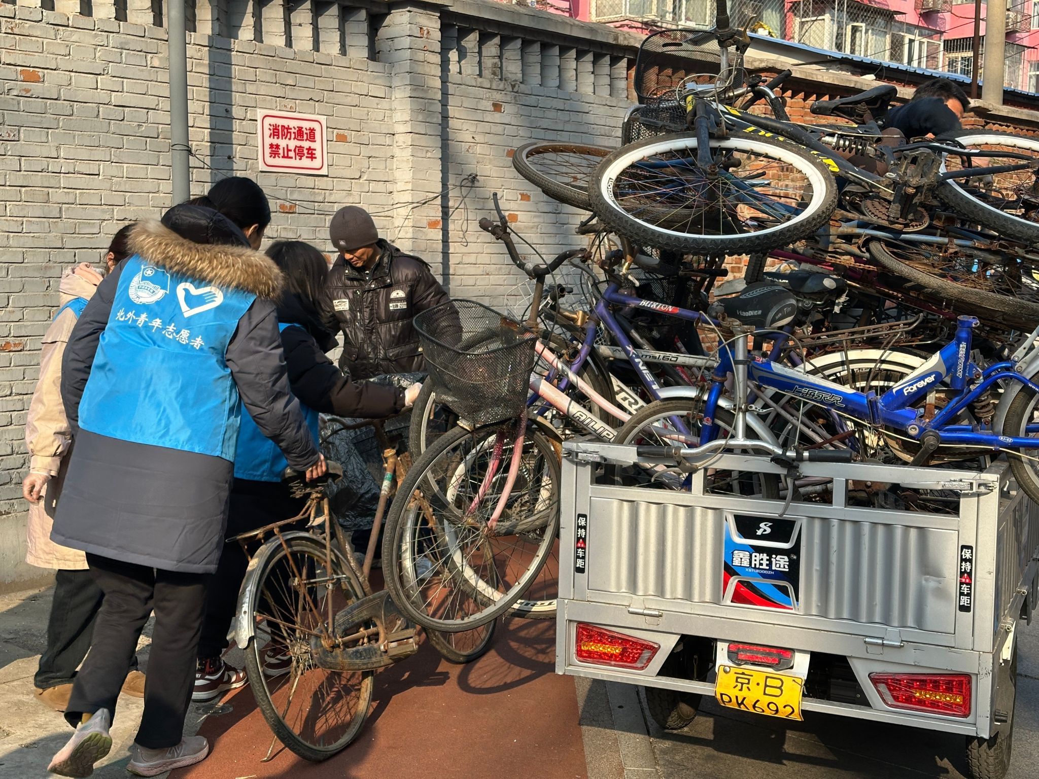 针对社区长期存在的“僵尸自行车”顽疾,beat365英国官网网站的志愿者们与北外社区工作人员及周边居民团结协作,展开整治行动。这些布满锈迹的车辆不仅占据公共空间,更形成卫生死角与消防安全隐患。大家协同搬运工人将废弃多年的自行车集中转运,同步清理绿化带内积存落叶。经过系统整治,腾挪出近20平方米的公共空间,让斑驳的社区绿地完整展露春色。