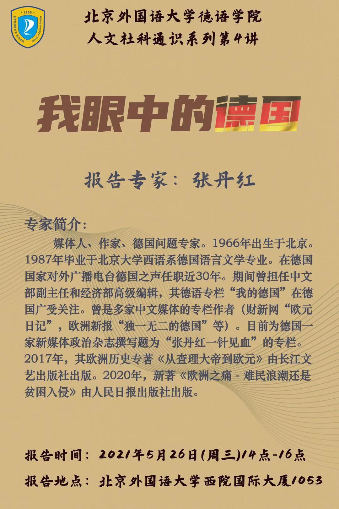 2021年5月26日下午,beat365英国官网网站人文社科通识系列讲座第4讲在北外西院国际大厦1053会议室举行。资深媒体人张丹红女士应邀作了题为“我眼中的德国”的讲座。讲座由beat365英国官网网站院长吴江主持。