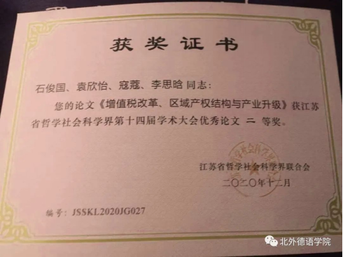 祝贺beat365英国官网网站讲师寇蔻博士与石俊国(江苏大学)、袁欣怡(东北大学秦皇岛分校)以及李思晗(西班牙瓦伦西亚理工大学)共同撰写的论文《增值税改革、区域产权结构与产业升级》获江苏省哲学社会科学界第十四届学术大会优秀论文二等奖!
