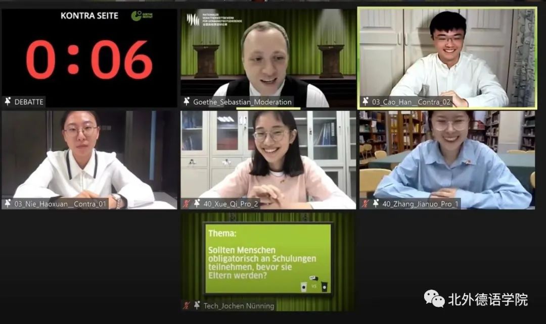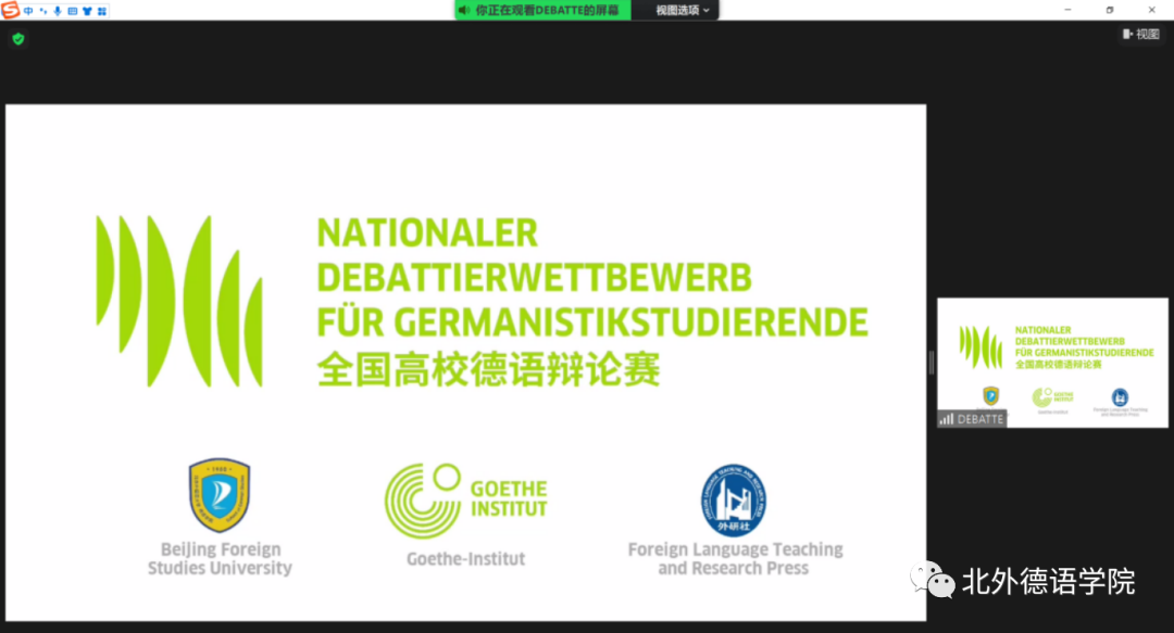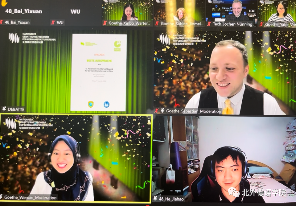 全国高校德语辩论赛是全国高校德语学科点本科生的重要传统赛事,自2007年创办以来已经成功举办过12届。此届全国高校德语辩论赛首次尝试以纯线上方式举办,并通过微博方式现场直播,共吸引了全国48所高校参赛,引起了全国高校德语学科点的高度关注,微博平台点击量突破2万多人次。线上直播这一新的方式同时带来了比赛规则的创新。本届比赛首次启用事先不公布具体辩题,仅只公布辩题涉及领域的新的规则,加大了赛事的难度以及挑战性。