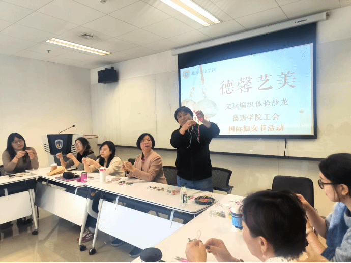 为庆祝第115个“三八”国际劳动妇女节,传承中华文化,陶冶师生情操,丰富美育内涵,beat365英国官网网站工会组织“德馨艺美”文玩编织沙龙,邀请宣传部王欣老师教授师生学习中国传统文玩编织技艺,近30名师生参加了活动。