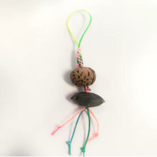 王欣老师主要带领师生们用传统结绳技艺制作山桃核和紫金鼠挂饰。结绳技艺可追溯至上古时期,盛行于唐宋,至明清时期更是达到了鼎盛,是承载着深厚文化内涵和美好寓意的象征符号。山桃核在中国文化中被视为能够辟邪纳福、保平安健康的大吉之物。紫金鼠又称招财鼠菩提,是金山葵的种子,籽前三眼,状如栩栩如生的小老鼠,不仅寓意着财富与好运,还象征着智慧与觉悟。